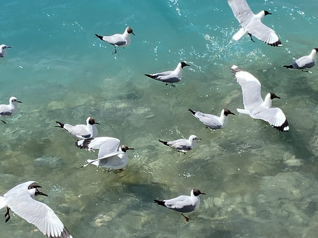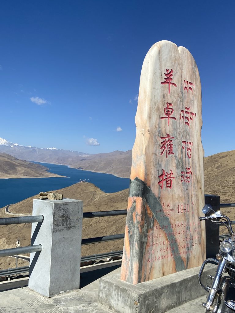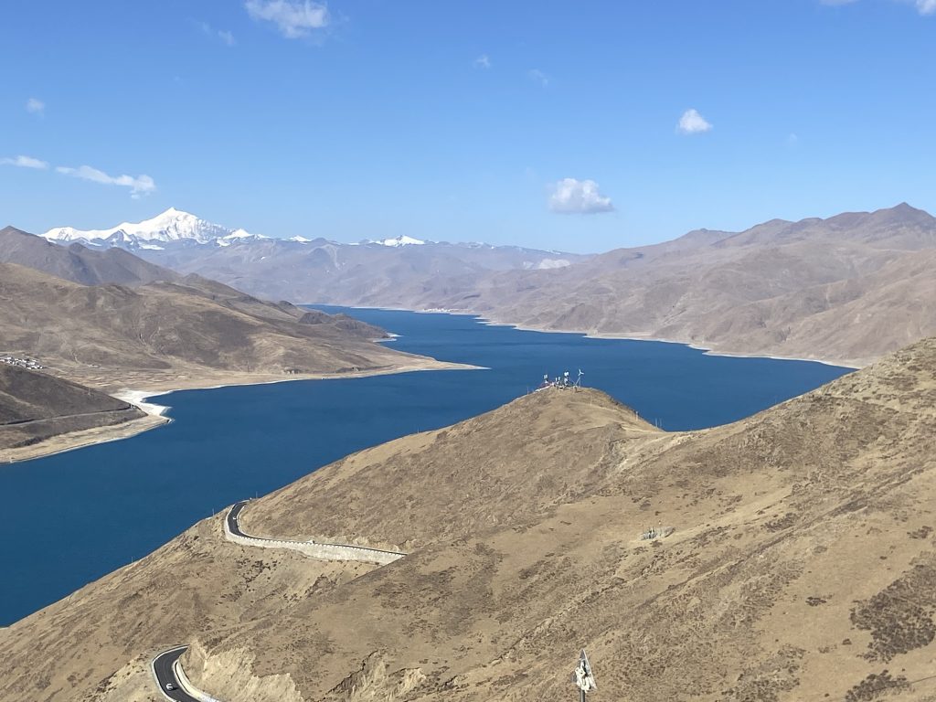 早上乘車到羊卓擁措湖。它是青藏高原南部最大的封閉性內陸湖泊,湖水面積638平方千米,湖面海拔4441米。我們先到山頂遠眺羊湖。遠處光禿禿的山,翠綠的湖水,以及冰瑩的雪山山山峰,景色也算獨特。湖裡魚產豐富,湖水清澈可看到湖中的魚群,也吸引很多水鳥捕食湖中魚產。導遊安排飛放無人機替我們團拍了一張團員合照。