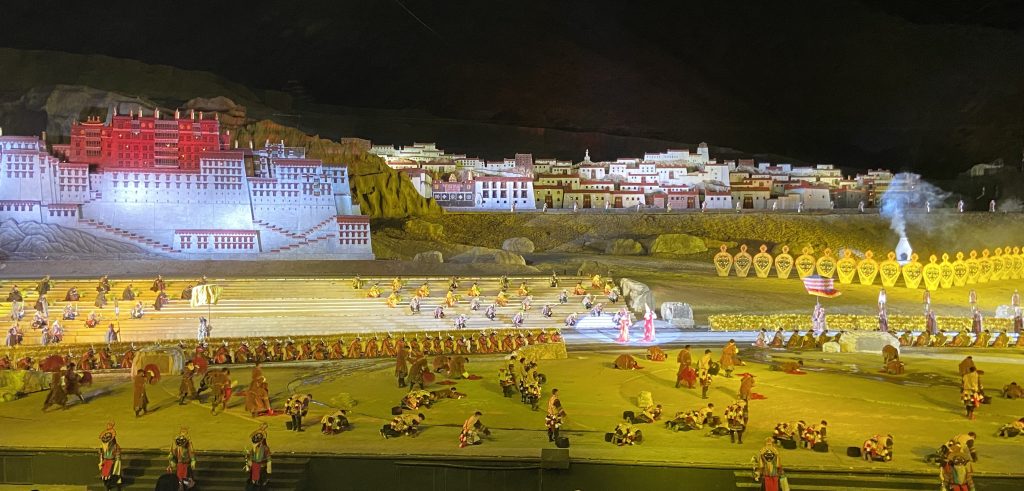 下午時分我們回到拉薩市區,提早吃了一頓豐盛的涮羊肉火鍋作晚飯。然後回旅館稍作休息,傍晚時乘車到近郊拉薩河旁山腰上蓋建的大型露天劇場,觀看大型實景劇文成公主。劇場隔著拉薩河與布達拉宮正對面,站在劇場外,可以看到布達拉宮及拉薩的漂亮夜景。