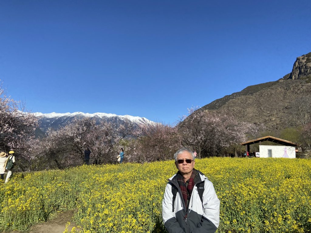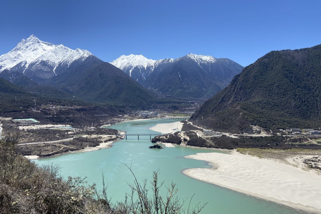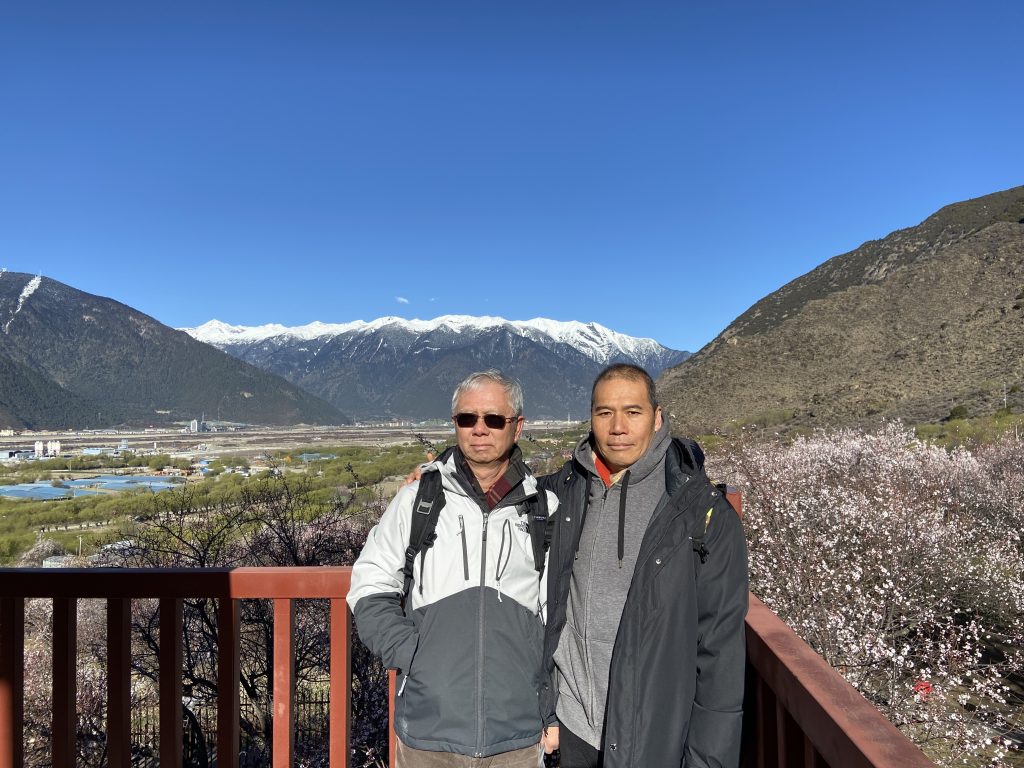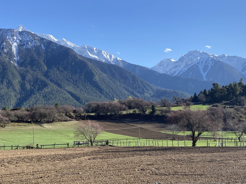早上起牀,走出客房的陽台,眼前又是一片漂亮的景色。渡假園區內的樹木已長出幼嫩的綠葉,襯托著正在盛開淡紅的桃花。不遠處是雅魯藏布江,碧綠的江水在泥黃的淺灘上緩緩流動。遠處則是綿延的山巒,晨曦照耀在雪山頂特別光輝明亮。背後更是一片萬里無雲蔚藍的天空。我坐在陽台上足足一刻鐘,欣賞那動人的景觀,感受那晨早的清新氣息。