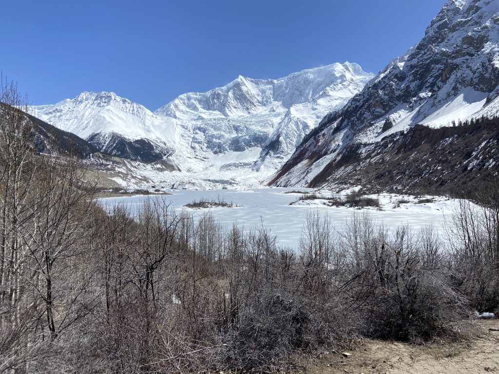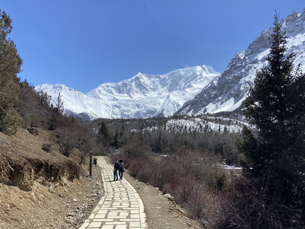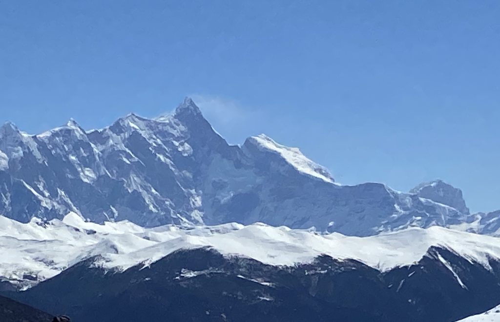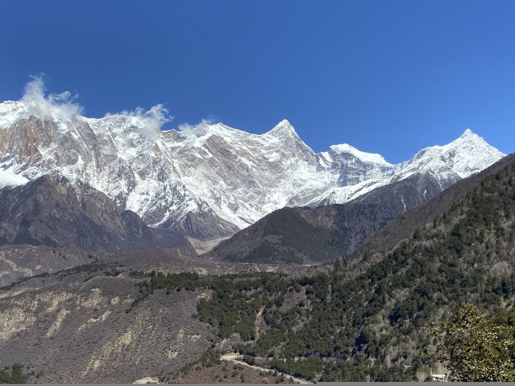 之後我們乘車穿過嘠隆拉雪山山口,嘎隆拉雪山位於西藏自治區林芝市墨脫縣—波密縣交界地帶,是崗日嘎布山脈的西端段,平均海拔4800米,山口海拔4200米左右。我們乘車登山口途中,隨團的醫護人員替各團員量血氧,又詢問團員有否身體不適。其後的行程中,隨團醫護每數小時就替團隊員量血氧,確保團員的身體狀況能適應有風險的活動。