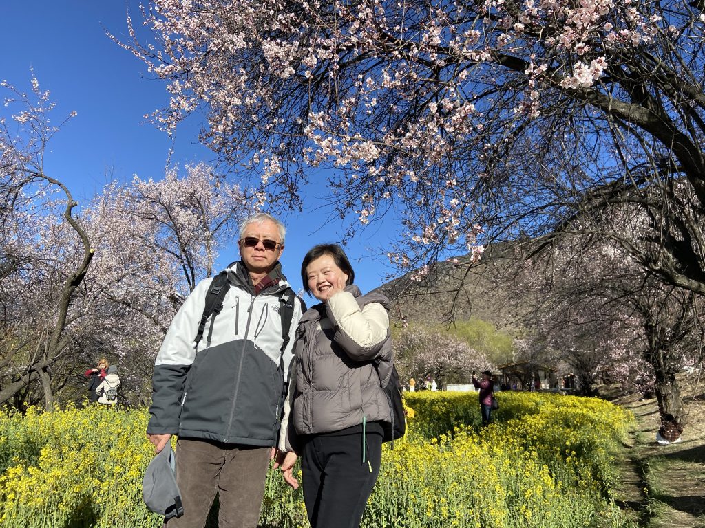 遊人們都忙於取景拍照,我亦打握機會想在花叢拍過獨照留念。但我又覺得我那六十來歲的白髪老翁實在與那漂亮的花朵不大相襯,於是我就找來我們青輕的導遊姑娘與我合拍一張照片留念。面對那豔麗的景色,人們的心境也變得輕盈活潑。