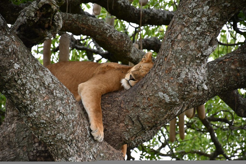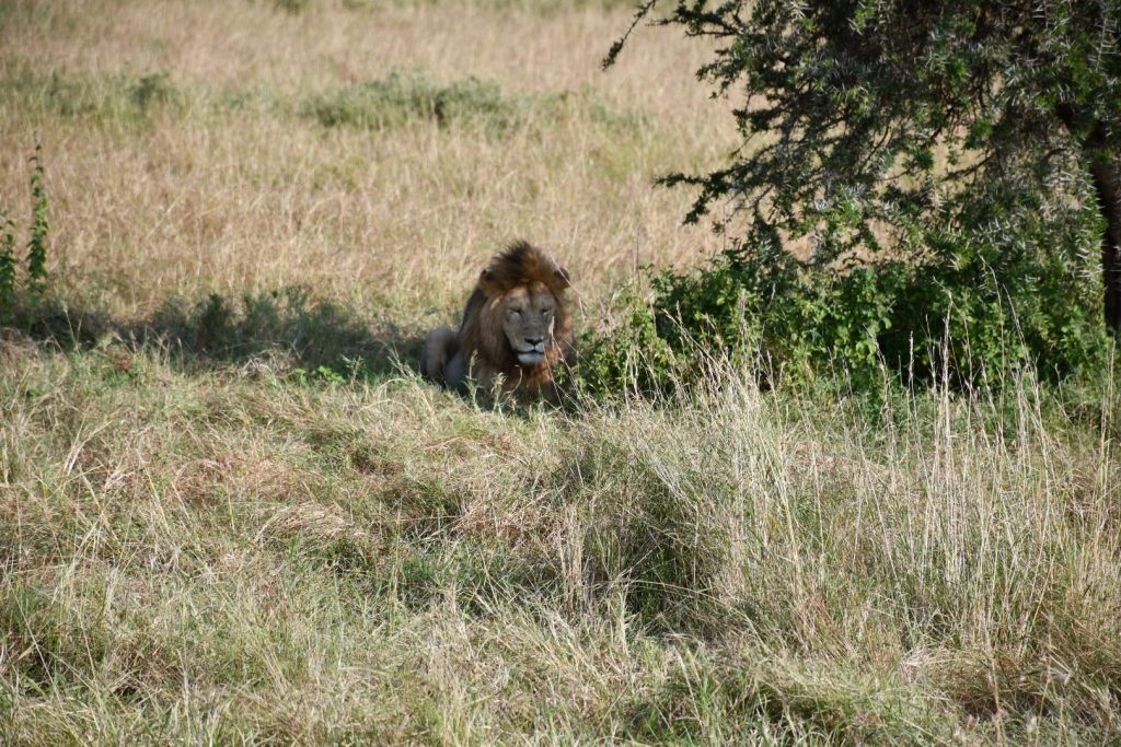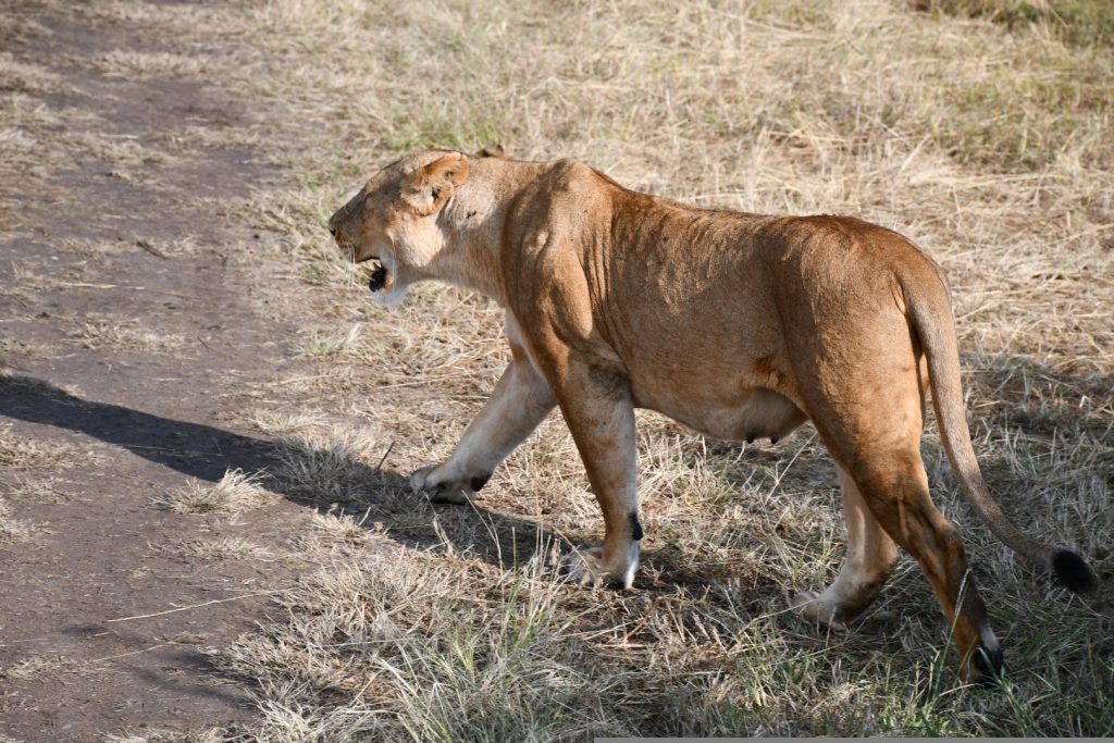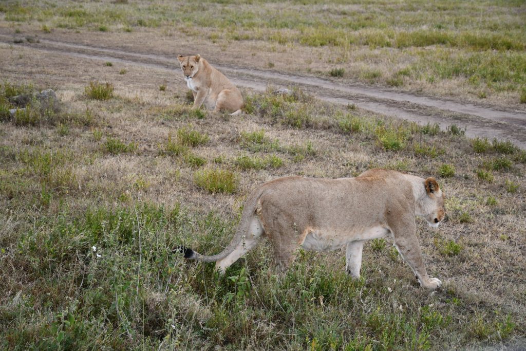 中午時份我們返回營地午膳並在營地午休兩個小時小時。下午再度出去看動物,這回我們看到野生動物園較為緊張的局面。我們先看到有兩隻母獅在草叢的遮掩下陪廻,不遠處是一羣小羚羊在吃草,當這兩隻獅子靠近到羚羊羣五十公尺左右就拔足狂奔往羚羊羣去捕獵。幸好羚羊群反應敏捷亦飛馳逃跑,那兩隻母獅無功而退。