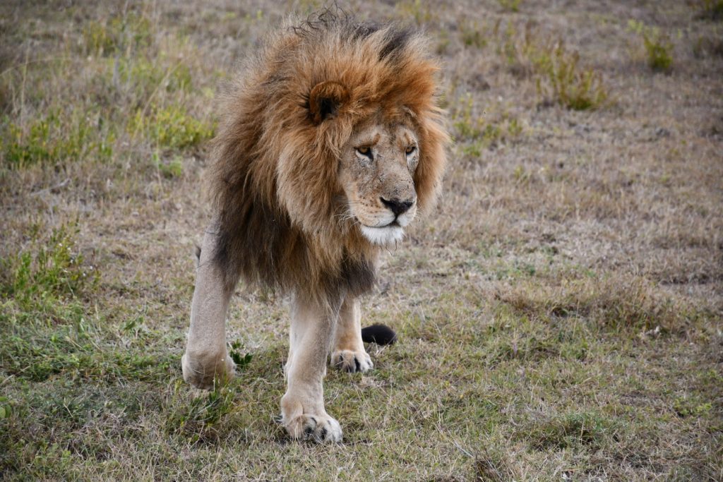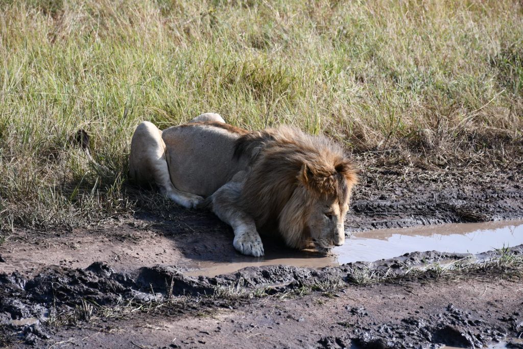 也遇到一頭孤獨的老弱公獅爬在路邊渴水。牠看起來很衰弱,可能也受了傷,完全看不到平常那些威武強壯公獅的樣子。