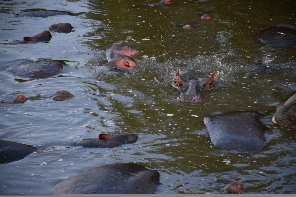 黃昏回營地前,我們又去了一池塘旁,近地觀看一群河馬。牠們很大,但也很臭,我們觀看了兩分鐘就忍不住要離開回營地了。